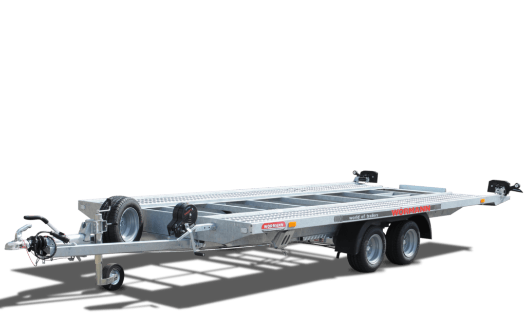 Remorque porte-voitures Carliner 2,7 t. Poids total, zone de chargement inclinable avec 2 amortisseurs, zone de chargement d'environ 4500 x 2100 mm, ouverte au milieu, compl. galvanisé, frein à inertie entièrement automatique. Marche arrière automatique, roue jockey renforcée, roue de secours avec support, mec. Treuil à câble (peut être monté à droite ou à gauche). Charge utile 2040 kg